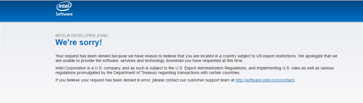درخواست شما رد شده است،زیرا ما بر این باور هستیم که شما در کشوری زندگی می کنید که محدودیت های صادراتی ایالات متحده برای آن اجرا شده است.ما از شما معذرت خواهی می کنیم،چرا که هم اینک قادر به ارائه درخواست شما به منظور دستیابی به بخش های نرم افزار،خدمات،دانلودها و تکنولوژی نیستیم.کمپانی اینتل،یک شرکت واقع در آمریکا بوده و تابع قوانین مدیریت صادرات است؛همچنین از قوانین اعلام شده توسط سازمان خزانه داری به منظور تجارت با برخی از کشورها،پیروی می کند.